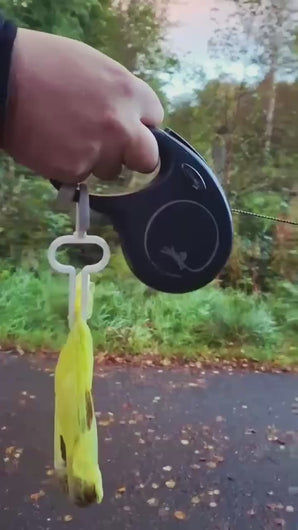 Er du også træt af at gå rundt med hundeposen i hånden? Hvor gør man lige af den, når turen først lige er startet? Løsningen er heldigvis super enkel: Bind en knude på posen Hæng den på vores smarte holder direkte på hundesnoren